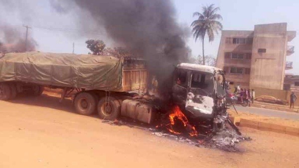 Akinbiyi also said traffic affected one lane of the road due to the reluctance of the mob in allowing the officials to remove the burnt trucks from the scene.